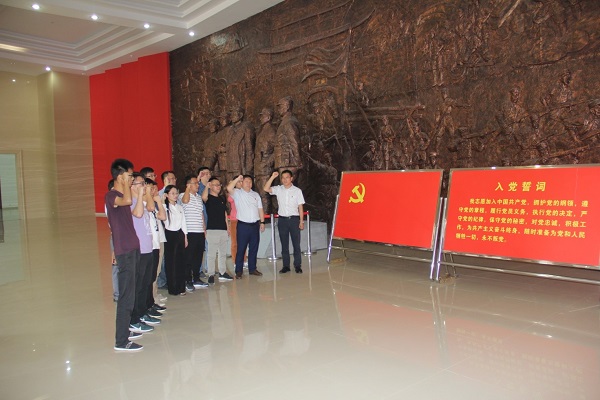 藕塘为抗日战争时期津浦路西革命凭证地中心,,素有“小莫斯科”之誉称,,是我省首批爱国主义教育基地。。。在庄重肃穆的义士陵园,,全体职员首先在解说员的向导舷菇廖旅行了藕塘纪念馆的各个展区,,寓目珍贵的文物、文献、照片等资料,,回首党的绚烂历程,,追寻英雄足迹,,思念先烈事迹,,再次被刘少奇、叶挺、罗炳辉等老一辈无产阶级革命家的壮烈事迹所感动。。。随厥后到纪念馆大厅前,,全体党员面临鲜红的党旗,,重温入党誓词,,进一步牢靠“不忘初心、切记使命”的政治信心。。。